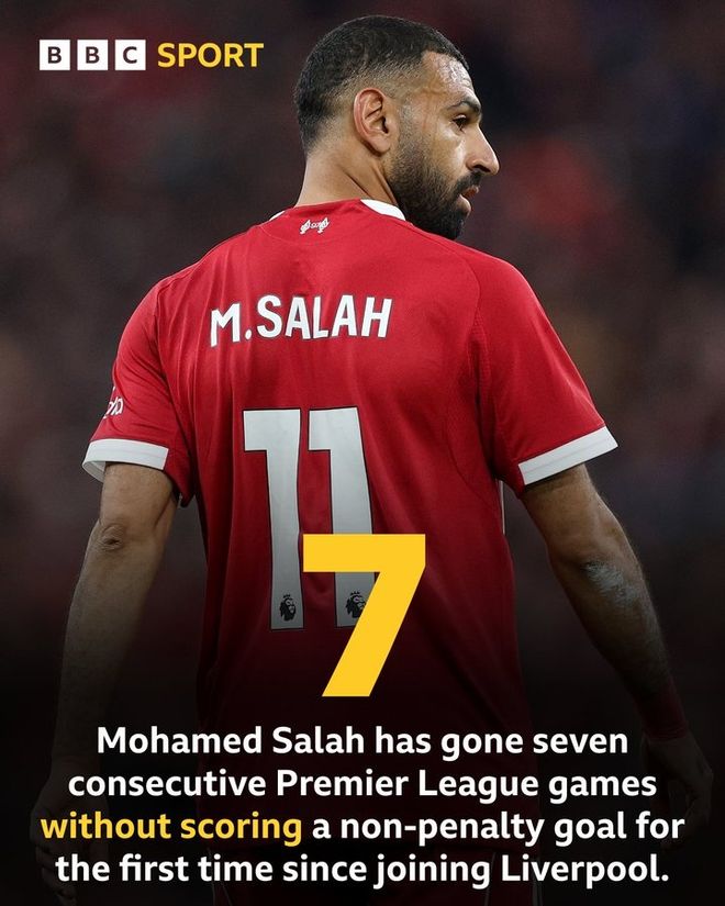 据BBC统计,萨拉赫连续7场英超比赛未能攻入非点球进球,他加盟利物浦以来首次遇到这种情况。