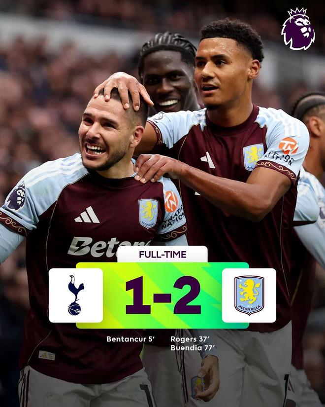下半场,布恩迪亚远射破门,帮助维拉反超。最终,热刺主场惨遭维拉逆转。