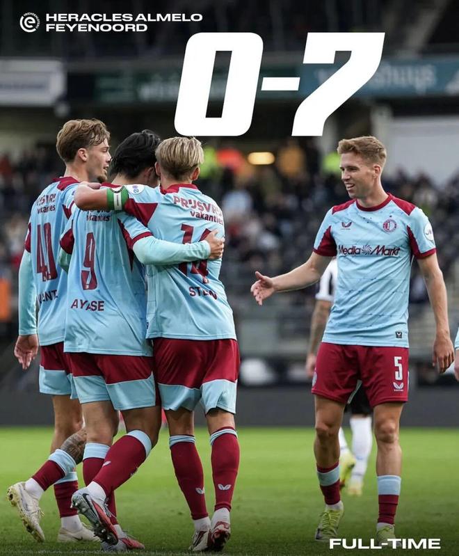 最终,费耶诺德在客场7-0狂胜对手,以25分领跑荷甲积分榜。